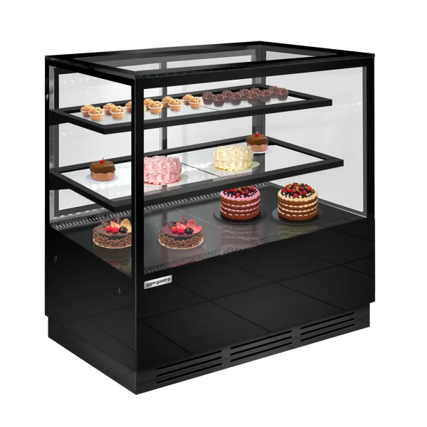 Chladiaca vitrína s LED osvetlením – 1000 mm – 378 l, ktorá ponúka vysokú kvalitu a čiernu farbu, je ideálnym riešením pre uchovávanie a prezentáciu tortov. Posuvné sklenené dvere umožňujú ľahký prístup do interiéru, kde sú výškovo nastaviteľné police. Pult má digitálny displej s možnosťou zobrazenia teploty a LED osvetlenie. Vyrobený je z vysoko kvalitnej nehrdzavejúcej ocele a má zadné posuvné dvere. Teplotný rozsah je od 2°C do 8°C. Pult má vpredu zatvorené a vzadu posuvné dvere, 2 police a výkon 450 wattov. Elektrické pripojenie je 1N/PE / 220 • 240 voltov / 50 Hz. Vonkajšie rozmery sú 1 000 mm x 730 mm x 1 200 mm. Pult je dodávaný s 2 sklenenými policami a má označenie CE v súlade so smernicami. Vyrobený je v súlade s hygienickými a bezpečnostnými pokynmi a materiál vyhovuje európskym potravinovým normám.