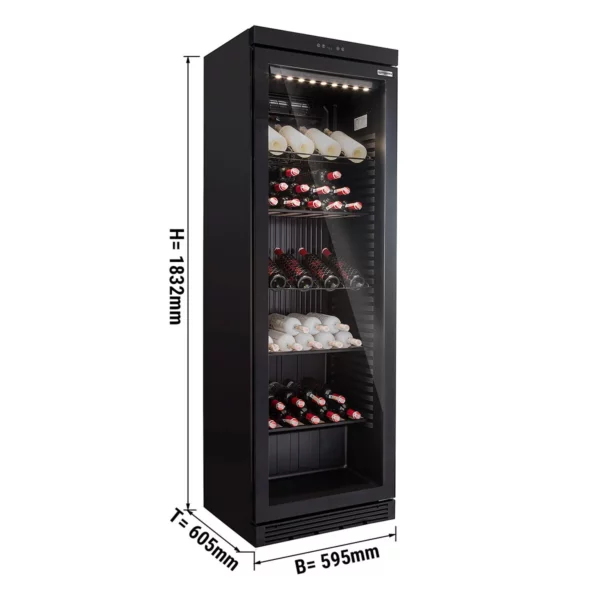 Moderný čierny dizajn s dvojitým skleneným dverami a drevenými policami zaručí nielen skvelý vzhľad, ale aj maximálnu funkčnosť a trvácnosť. Vybavená vnútorným LED osvetlením a intuitívnym digitálnym displejom, umožňuje jednoduché ovládanie a manipuláciu.