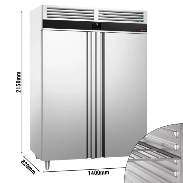 Táto prémiová chladnička je ideálnym riešením pre tých, ktorí hľadajú účinné a úsporné chladenie. S vylepšeným výparníkom a ventilátorom poskytuje zvýšenú účinnosť, zatiaľ čo optimalizovaný cyklus rozmrazovania skráti časy čistenia. Samozatváracie dvere s funkciou aretácie uľahčia manipuláciu a robustná nerezová konštrukcia zabezpečí dlhú životnosť.