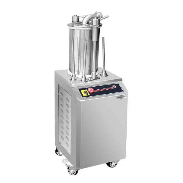 Hydraulická plnička klobás s kapacitou 26 litrov je výkonné stojace zariadenie, ktoré dokáže vyrobiť až 400 kg klobás za hodinu. Ovládanie je veľmi jednoduché pomocou nožného spínača a čistenie je jednoduché. Vyrobené je výhradne z vysoko kvalitnej nehrdzavejúcej ocele AISI 304, čo zaručuje kvalitu a tichú prevádzku. Vonkajšie rozmery sú 590 mm x 460 mm x 1 340 mm. Rozsah doručenia zahŕňa 4 lieviky a plniace nástavce na klobásy s priemerom 16, 19 a 25 mm. Použitie je jednoduché a výrobok je vyrobený v súlade s hygienickými a bezpečnostnými pokynmi. Má označenie CE a materiál zodpovedá európskym potravinovým normám.
