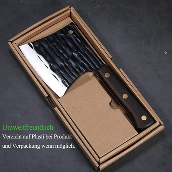 Kuchynská sekera na kosti má vyčnievajúci obdĺžnikový tvar čepele, ktorá je hrubá, ťažká a veľmi robustná. Je schopná ľahko presekať kosti, šľachy a mäso v jednom kuse. Ostrá a široká čepeľ uľahčuje prácu. Rukoväť je vyrobená z masívneho dreva, ktoré je krásne zrnité a perfektne sedí v ruke. Táto kuchynská sekera je známa ako sekera na kosti, sekačka alebo štiepačka a je vyrobená z kvalitných materiálov. Jej dĺžka čepele je 14 centimetrov a celková dĺžka položky je 28,2 cm.