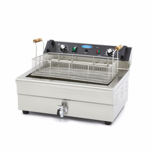 Maxima Elektrická fritéza s kohútikom – 1 x 20 l | 09365020 je vynikajúci produkt, ktorý ponúka luxusné a profesionálne výsledky. Jeho vysoko kvalitné diely a hladký povrch zabezpečujú jednoduché čistenie. S objemom 20 litrov je veľmi kompaktný a ideálny pre intenzívne použitie v gastronomických prevádzkach. Fritéza je vybavená vypúšťacím ventilom a kohútikom na kuchynský olej, ktorý uľahčuje čistenie aj vnútra. Technické parametre zahŕňajú nastaviteľný termostat, ochranu proti preťaženiu, odnímateľné veko a 4 gumené nohy pre stabilnú polohu. Celková hmotnosť stroja je 16,7 kg a rozmery sú 590 x 525 x 365 mm. Fritéza pracuje na 400 V / 50 Hz / 3 fázy 4 500 Watt. Výhody zahŕňajú luxusný povrch, vysokú kvalitu dielov, kompaktnosť, ľahké čistenie a praktický kohútik na olej.