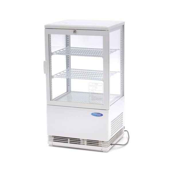 Táto moderná výstavná chladiaca vitrína ponúka viac ako len úložný priestor s objemom 58 litrov. Je vytvorená tak, aby vaše produkty vyzerali čo najlepšie, vďaka dvom jednoducho nastaviteľným poličkám, ktoré si môžete prispôsobiť podľa vašich potrieb. S pôsobivým štvoročných sklenených okien a integrovaným LED osvetlením, produkty sú vždy príťažlivo prezentované, nech už je to v kaviarni, na bare alebo v reštaurácii. So zabudovaným zámkom je vhodná na umiestnenie na dostupných miestach bez starostí.