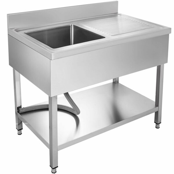 Nerezový drez a umývací stôl s policou L 100x60cm je vyrobený z nehrdzavejúcej ocele, čo zaručuje jeho robustnosť a odolnosť. Je ideálny pre komerčné aj súkromné použitie a ponúka dostatok priestoru vďaka veľkému umývadlu s rohom v tvare písmena R. Okrem toho, má užívateľsky prívetivý dizajn a bezproblémové pripojenie.