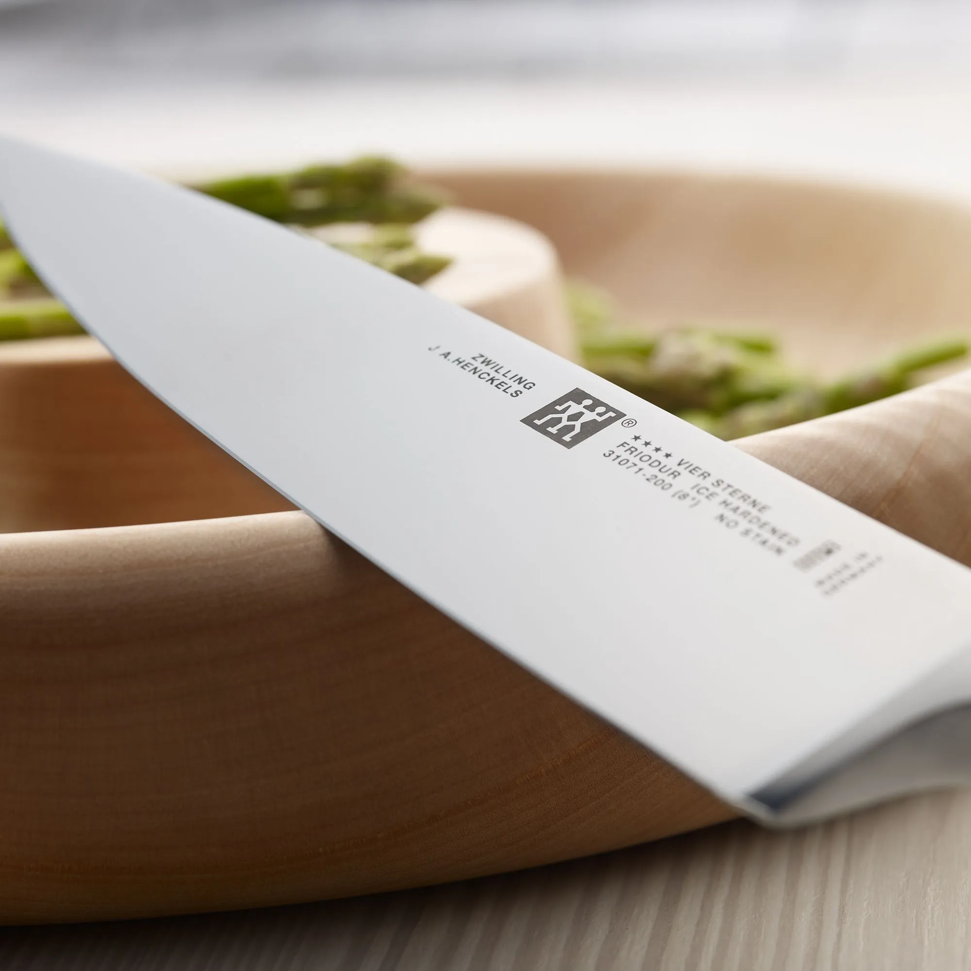 Celosvetovo uznávaný rad nožov VIER STERNE je majstrovským dielom v oblasti bezpečnosti, ergonómie a jednoduchosti používania. Nože sú vybavené špeciálnym ľadom tvrdeným ostrím FRIODUR®, ktoré zaručuje dlhotrvajúcu ostrosť a odolnosť. Ergonomická rukoväť z kvalitného plastu zabezpečí pohodlné a stabilné uchopenie, zatiaľ čo plynulý prechod medzi rukoväťou a čepeľou pridáva k elegantnému dizajnu nožov. Robustná čepeľ znamená viac sile pri každom záreze.