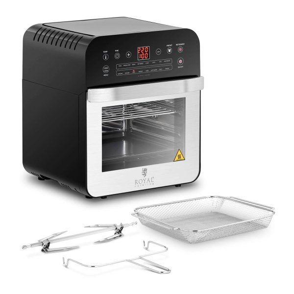 Royal Catering RCAF-12L teplovzdušná rúra – 1 600 W – 13 programov je digitálna teplovzdušná rúra z ušľachtilej ocele. Je univerzálna vďaka trom funkciám a 13 programom, má vysoký výkon 1 600 W a teploty od 50 do 220 °C. Objem rúry je 12 l a má jednoduché ovládanie pomocou dotykovej plochy a LED displeja. Vnútro rúry je vyrobené z ušľachtilej ocele, čo zaručuje hygienické vlastnosti a jednoduché čistenie. Tento konvektomat je ideálny na prípravu rôznych jedál v reštauráciách, kaviarňach, bistrách, kinách, na čerpacích staniciach, ale aj v súkromných domácnostiach. V balení nájdete variabilne použiteľnú rukoväť, rošt, plech, ražeň a misku na odkvapkávanie. Technické parametre zahŕňajú kapacitu 12 l, výkon 1 600 W, materiál plášťa nehrdzavejúca oceľ a plast, materiál dverí tvrdené sklo, materiál vnútorného priestoru ušľachtilá oceľ, časovač s trvaním 0 – 60 min a rozmery 33 x 31 x 37.3 cm. Hmotnosť produktu je 7.5 kg.