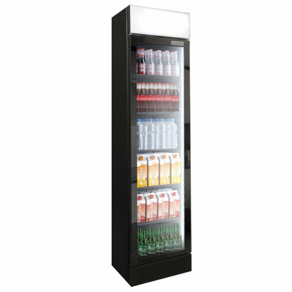 Úzka nápojová chladnička – objem 145 l, čierna, je chladnička na nápoje s lakovaným oceľovým telom a prednou stranou vo vysokom lesku. Má 5 políc a integrované koľajnice, s plastovým interiérom a čiernou farbou. Bezrámový dizajn vytvára elegantný a ľahký vzhľad, s podsvieteným reklamným displejom a vnútorným osvetlením pomocou LED pásikov. Má digitálny teplomer a samozatváracie dvere s zarážkou vpravo. Chladenie je konvekčné a používa chladivo R290 bez freónov, s vysokým výkonom a nízkou spotrebou energie. Elektrické pripojenie je 1 / N / PE 230 voltov / 50 Hz a výkon je 2,81 kW/24h. Vonkajšie rozmery sú 435 x 460 x 2013 mm a kapacita je 145 litrov. Produkt je dodávaný vrátane 5 nosných mriežok.