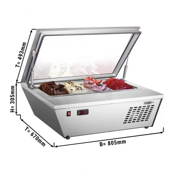 Model EAVNR77 – Vitrína na zmrzlinu s kapacitou 4 x 5 litrov je stolová jednotka. Má oblúkové čelné sklo, ktoré sa dá otvárať spredu a statické chladenie. Funkcia automatického odmrazovania zabezpečuje optimálnu prezentáciu produktu. Teplotu je možné nastaviť pomocou digitálneho displeja a jednotka je ľahko čistiteľná. Vyrobená je z vysoko kvalitnej nehrdzavejúcej ocele a má extrémne vysokú energetickú účinnosť. Je mimoriadne tichá a má vysokú stabilitu s 4x výškovo nastaviteľnými nožičkami. Má nezávislý chladiaci systém a chladivo R 290/63 g, bez CFC. Teplota sa pohybuje v rozmedzí 0 ° C ~ •25 ° C. Výkon je 162 wattov a elektrické pripojenie je 1N/PE / 230V / 50 Hz. Vonkajšie rozmery sú Š x H x V: 805 mm x 670 mm x 305 mm. Produkt je dodávaný vrátane 4 nádob.