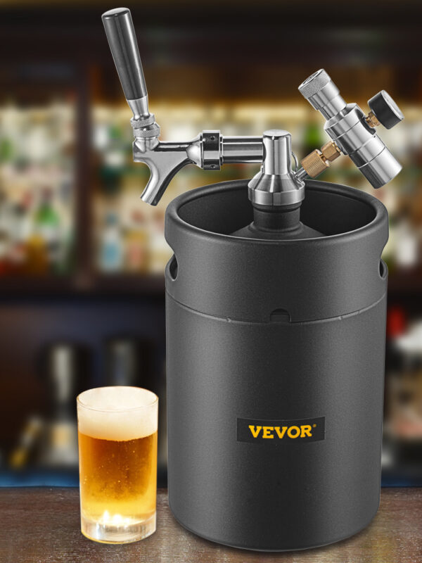 Výčapné zariadenie na pivo s tlakomerom, 5 L, čierna, umožňuje naliať približne 10 šálok čerstvého piva s kapacitou 5 litrov a veľkosťou Φ 7,3 x 12,6 palca (Φ 185 x 320 mm). Je ľahký a malý, s dutými drážkami na oboch stranách pre pohodlné prenášanie, čo ho robí ideálnym pre akékoľvek dobrodružstvo. S vylepšeným regulátorom tlaku, ktorý podporuje čítanie dvoch psi a barov, môžete ľubovoľne ovládať tlak vo vnútri a vychutnávať si dokonalú penu pri každej šálke piva. Každá časť výčapného kohútika je vyrobená z potravinárskej nehrdzavejúcej ocele 304, poskytuje pevnú štruktúru a udržuje pivo čisté a hygienické. Čierna prášková vrstva na vonkajšej strane ponúka pohodlný pocit z ruky, štýlový vzhľad a dlhú životnosť. Dostanete tiež kompletné príslušenstvo vrátane 20•palcovej trubice na pivo, silikónových krúžkov, hrotu uzáveru, hrdla a gombíka, regulátora tlaku a protišmykového uzáveru. Krúžok na odľahčenie tlaku je integrovaný do uzamykacej tyče a rukoväte na oboch stranách sú vhodné na prenášanie, čo robí tento dávkovač piva prenosným kdekoľvek inde. Odnímateľný nástavec je možné nahradiť uzáverom so závitom, čím sa z tlakového vrkoča stane nádoba na sódu. Je vhodný pre domácnosť, bar, párty, kemping atď., Udrží vaše nápoje čerstvé a podtlakové bez ohľadu na to, či ste doma alebo vonku. Arómy, chute a jedinečné vlastnosti vašich pív, nealkoholických nápojov alebo iných nápojov sú tiež zachované. Technické parametre zahŕňajú kapacitu 5 litrov, materiál nehrdzavejúca oceľ 304, vonkajšiu úpravu čiernym práškovým náterom, hrúbku pivného suda 0,8 mm, rozsah tlaku 0~2bar, rozmery produktu Φ 185 x 320 mm a hmotnosť produktu 3,0 kg.